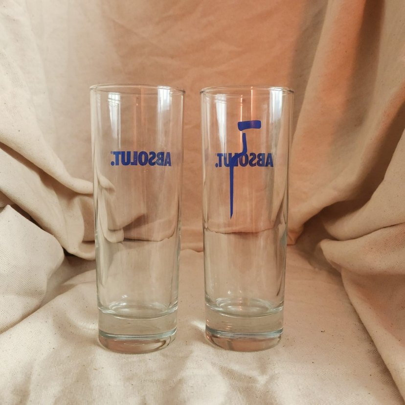 İki adet uzun, ince bardak seti, üzerlerinde açık mavi baskılı yazı ve tasarım bulunur. Şeffaf ve sade şekildedir.