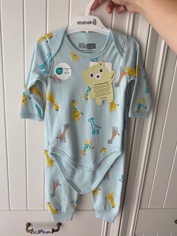 Pastel mavi renkli, uzun kollu ve düğmeli bebek body. Pamuklu kumaştan, zürafa desenli, rahat ve kullanışlı.