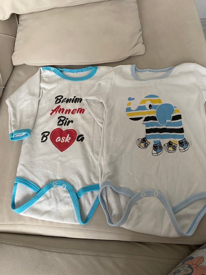 Mavi tonlarında, uzun kollu pamuklu bebek bodyleri. Birinde baskılı yazı ve kalp, diğerinde fil deseni bulunur. Düğmeli ve yuvarlak yakalı.