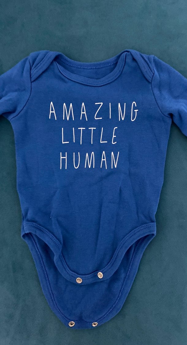Koyu mavi, uzun kollu ve bisiklet yaka, üzerinde "AMAZING LITTLE HUMAN" yazılı baskılı örme kumaştan bebek body. Rahat sokak stili.