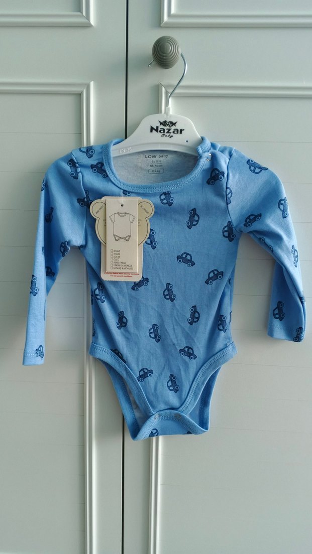 Mavi renkli, uzun kollu, yuvarlak yakalı bebek body, baskılı arabalı desene ve örme dokusuna sahiptir. Yumuşak ve sıcak kumaştan üretilmiştir.