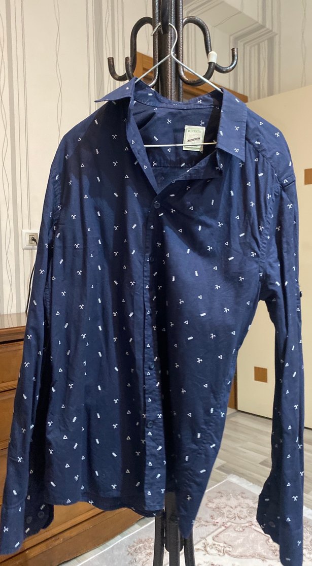 Mavi renkli denim kumaştan, baskılı, düğmeli ve yaka detaylı, bol kesim uzun kollu gömlek. Günlük kullanım için uygundur.