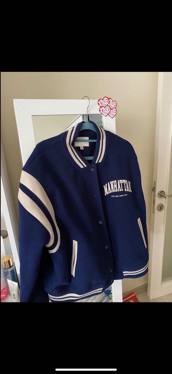 Koyu mavi, gevşek kesim ceket uzun kollu ve kesimli yakaya sahiptir. Düğmeli ve "MANHATTAN" baskılıdır. Yumuşak, sıcak kumaştan yapılmıştır, günlük kullanıma uygundur.