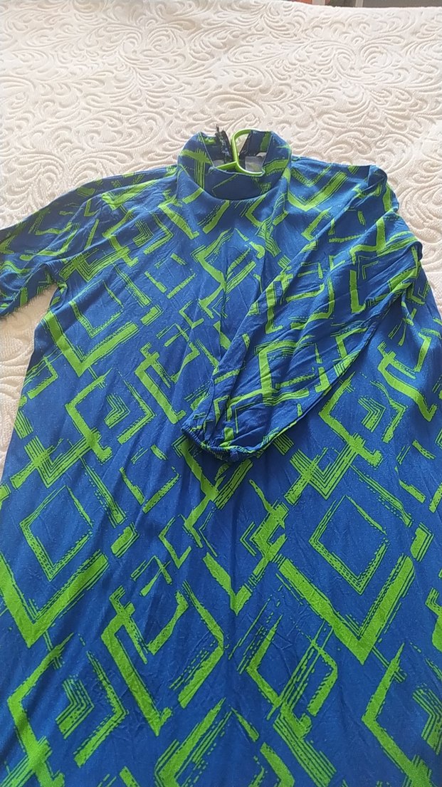 Hamile tunik, uzun kollu ve boğazlıdır. Dökümlü ve bol kesimdir. Canlı mavi tie-dye desenli, sentetik kumaştan yapılmıştır. Günlük kullanıma uygundur.