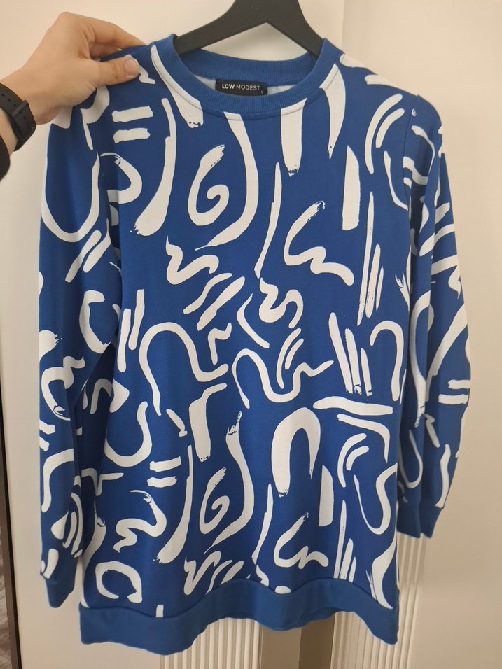 Uzun kollu, baskılı ve mavi renkte, rahat kesimli sweatshirt. Suni kumaştan üretilmiş, günlük kullanıma uygun şık bir sokak tarzı ürünü.