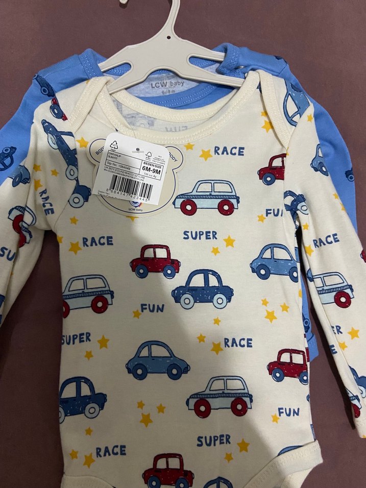 Bebek için örme, yumuşak ve sıcak kumaştan yapılmış, mavi tonlarında baskılı uzun kollu body. Üzerinde araba desenleri ve "RACE, SUPER" yazıları bulunur. İkili zıbın etiketli 6-9 ay erkek
