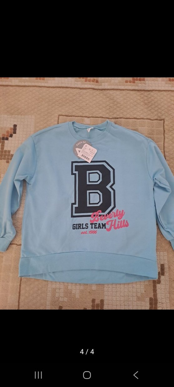 Pastel mavi, baskılı, düğmeli, uzun kollu, bol kesim sweatshirt. Yumuşak kumaşıyla rahat kullanım sunar. Önünde "Beverly Girls Team Hills" yazısı bulunur. Sıfır urun etiketli gonderilecek kumaşı 2 iplik ince penye degil orta kalinlik 8.9 yas ve 5.6 yas bedenleri vardir