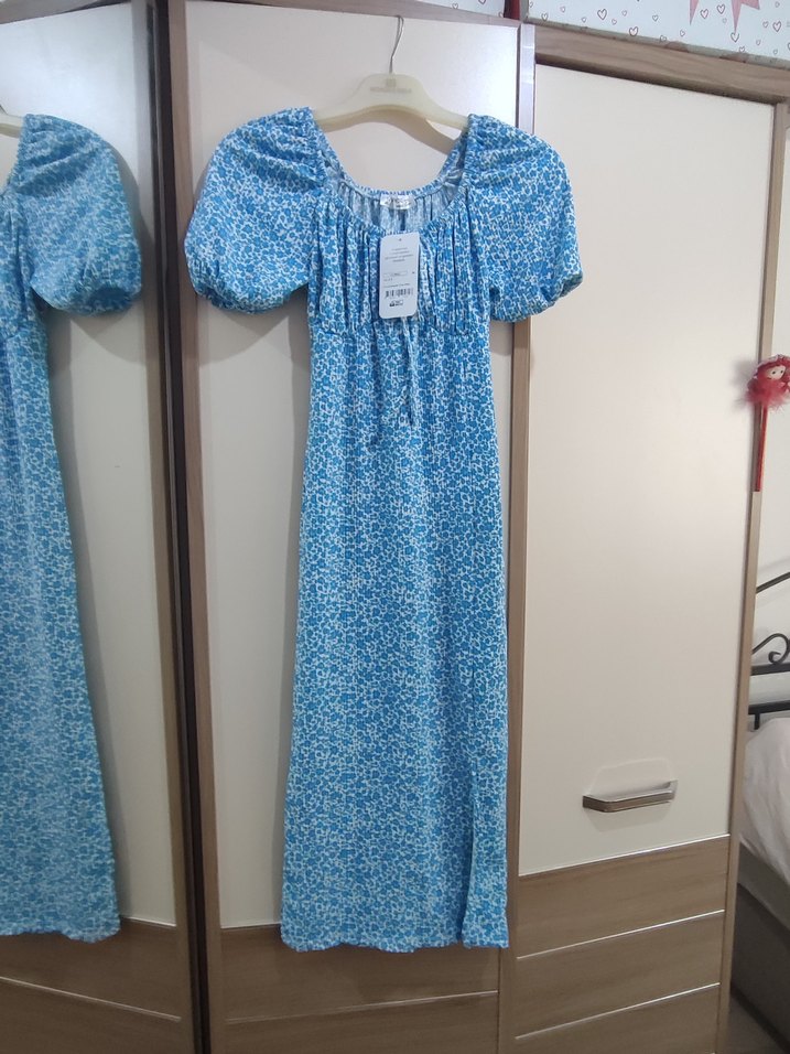 Pamuklu, uzun ve bol kesim elbise, kısa kollu ve pastel mavi baskılı. Püskül detaylı ve straplez yakalı, günlük kullanım için uygun.