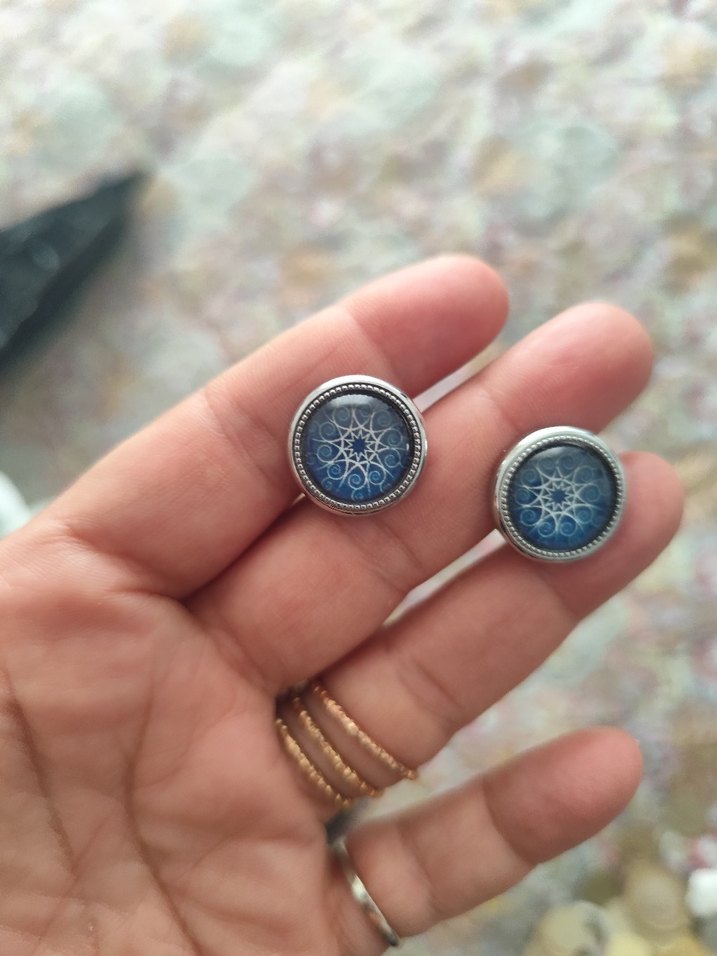 Mavi ve gri tonlarda baskılı, düğmeli kadın kol düğmeleri. Vintage bohem tarzını yansıtır, günlük kullanım için uygundur.