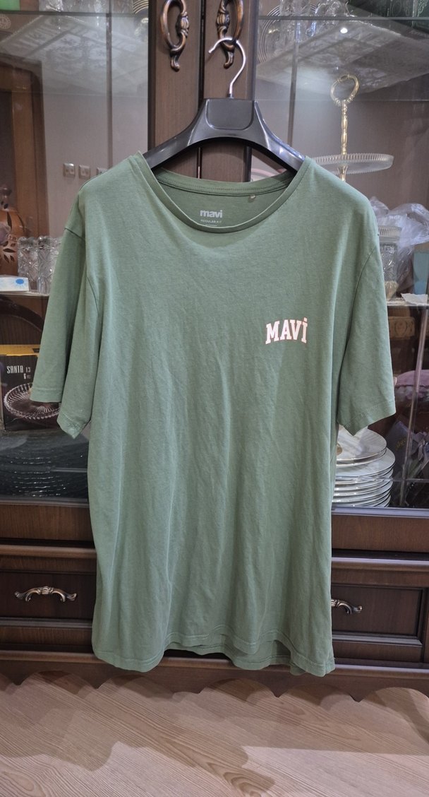 Yeşil pamuklu, kısa kollu, bisiklet yaka ve bol kesim erkek tişört. Pastel renkli "MAVi" baskılı, rahat sokak stili için uygun.