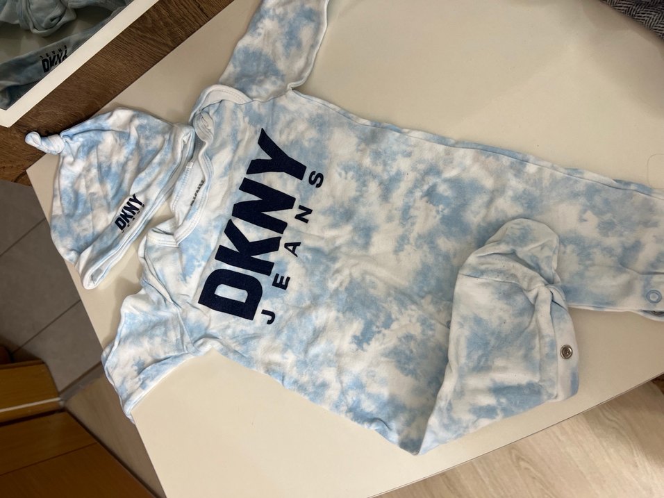 Mavi batik desenli denim bebek body, kısa kollu ve bisiklet yaka. Önden fermuarlı ve DKNY Jeans baskılı sokak tarzı bir modeldir.