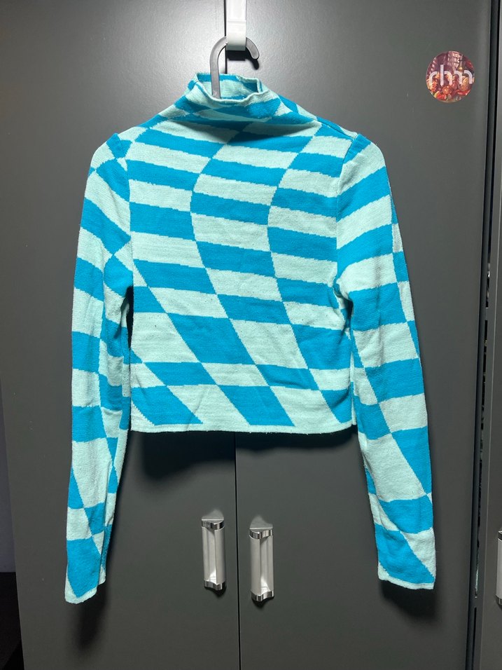 Fitted kesim, uzun kollu ve boğazlı mavi batik desenli triko kazak. Sokak modasına uygun, yumuşak ve sıcak kumaştan, günlük kullanıma uygun.