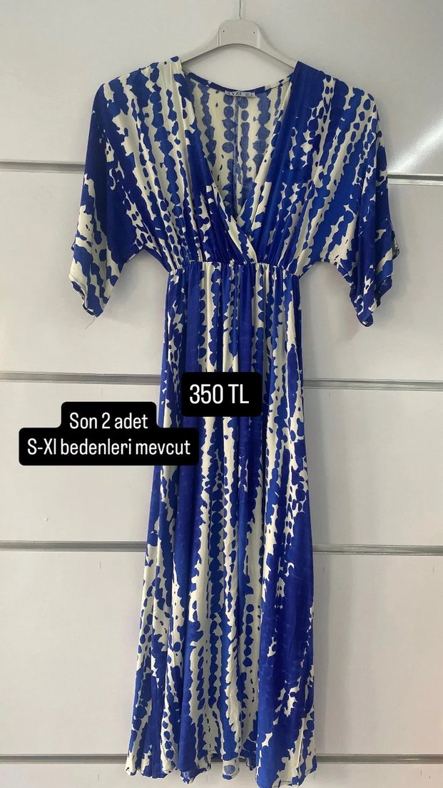 Bol kesim, mavi batik desenli uzun elbise. Kısa kollu, drapeli ve V yakalı. Yumuşak kumaştan, günlük kullanım için uygun. S-XL beden, 350 TL.