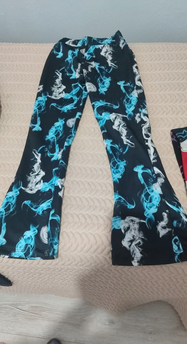 için uzun boy, ispanyol paça, mavi batik desenli, drapeli sentetik kumaştan pantolon. Bohem ve hippie tarzına uygun, dış mekan kullanımı için rahat. Ölçü sorabilirsiniz