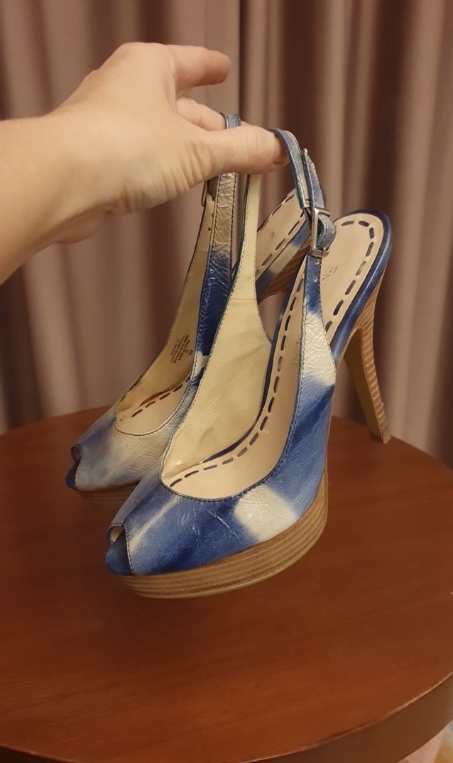 Mavi batik desenli denim platform topuklu ayakkabılar, tokalı kayış ve bohem tarzıyla romantik buluşmalar için uygundur.