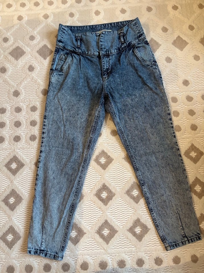 Gri ve mavi batik desenli, düğmeli, bol kesim kadın jean. Normal boyda, denim kumaştan, günlük rahat sokak tarzına uygun.