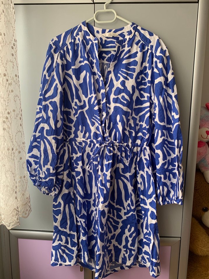 Mavi batik desenli, hafif keten kumaştan bol kesim hamile tunik. Yüksek yaka, uzun kollu ve fırfır detaylıdır. Bohem tarz için uygundur.