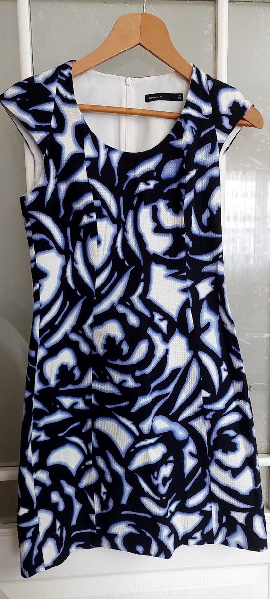 Kolsuz, tekne yaka, normal boy midi elbise. Koyu mavi batik desenli,, sentetik kumaştan. Günlük çağdaş kullanım için uygun. karen millen marka 38 beden renkli günlük elbise boy 87 bel 73 cm