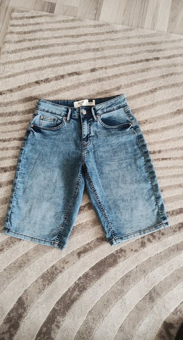 mavi batik desenli, dar kesim likralı, rahat mini denim şort. Günlük kullanıma uygun rahat ve şık sokak stili.