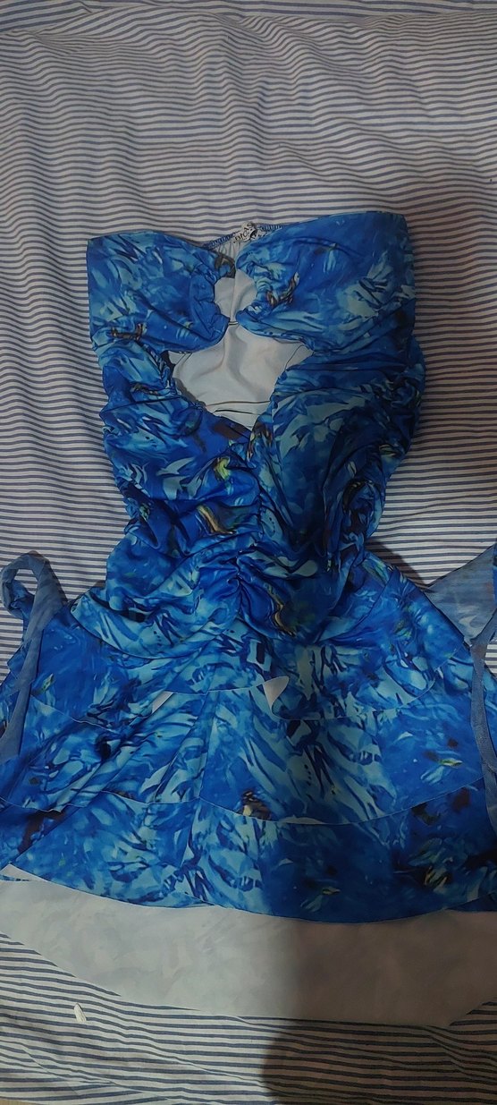 Parlak mavi batik desenli, drapeli ve askılı kollu, bohem tarzda kadın monokini, parti için uygun.