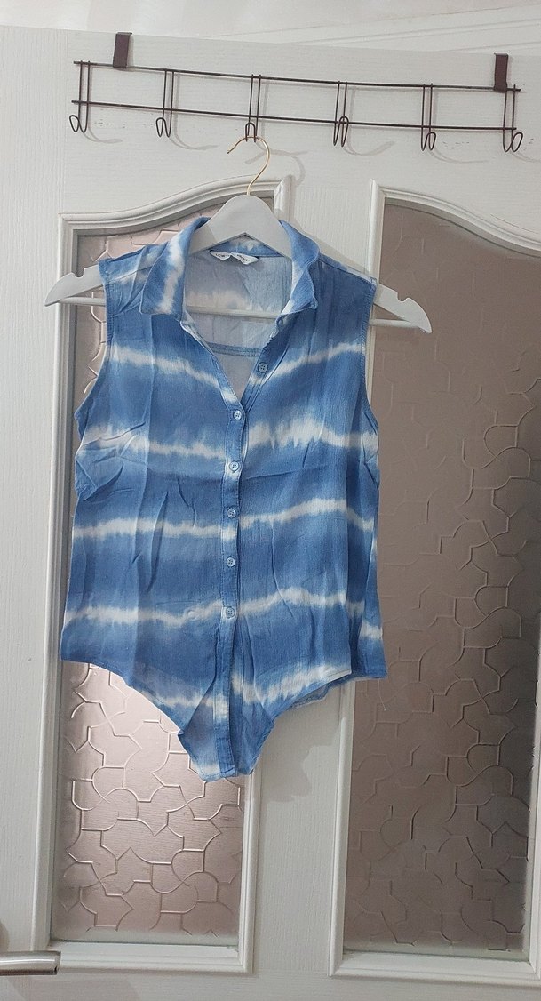 Mavi pastel tonlarda batik desenli, kolsuz, düğmeli ve V yakalı pamuklu mini gömlek. Rahat kesimiyle günlük kullanıma uygundur. 11-12yas az kullanılmış