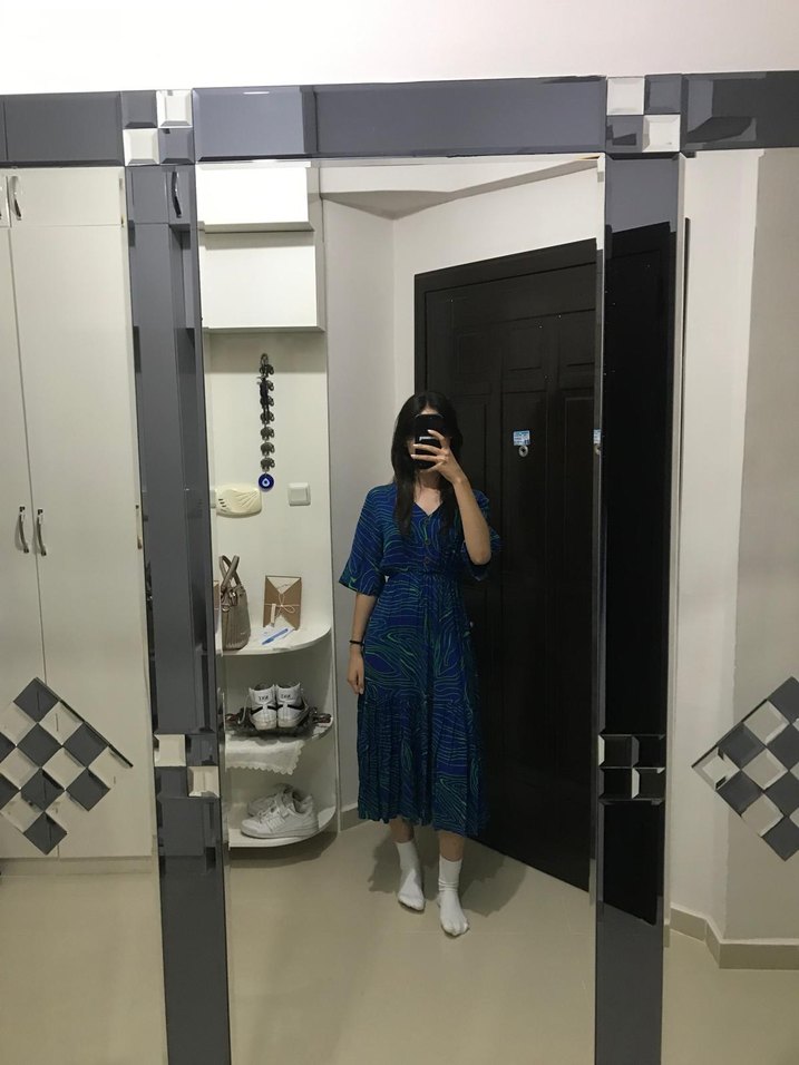 Koyu mavi batik desenli penye elbise, bol kesim, V yaka ve kısa kolludur. Ofis için uygun, detaylı midi boy elbisedir.