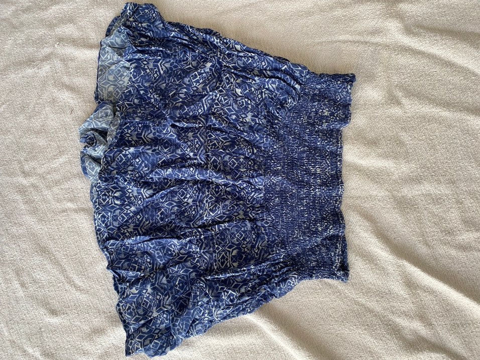 Mavi batik desenli, volanlı detaylara sahip, bol kesim mini etek. Yumuşak dokulu kumaştan üretilmiştir.