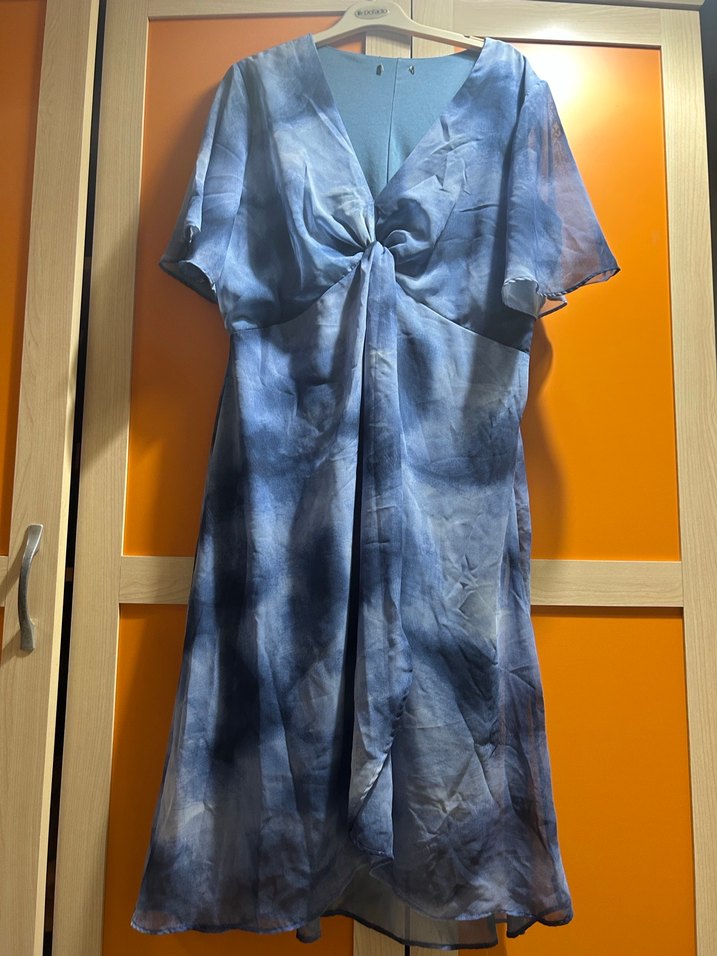 Mavi ve gri batik desenli, yumuşak şifon kumaştan yapılmış, V yakalı, kısa kollu, uzun ve bol kesim elbisesi. Drapeli tasarımı ile düğünler için uygun.
