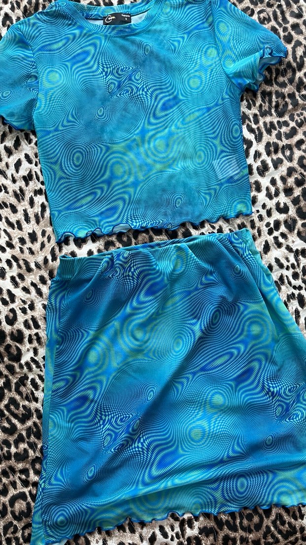 Renkli mavi batik desenli, drapeli, yumuşak sentetik kumaştan yapılmış, uzun ve dar kesim, açık hava kullanımı için uygun.2 sini birlikte koyuyorum