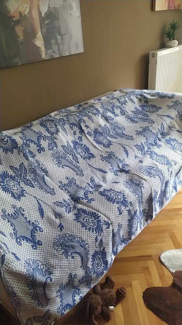 Mavi tonlarda batik esenli tek kişilik pike, koltuk örtüsü de olur, eni 1,35 cm, boyu 2,5 cm