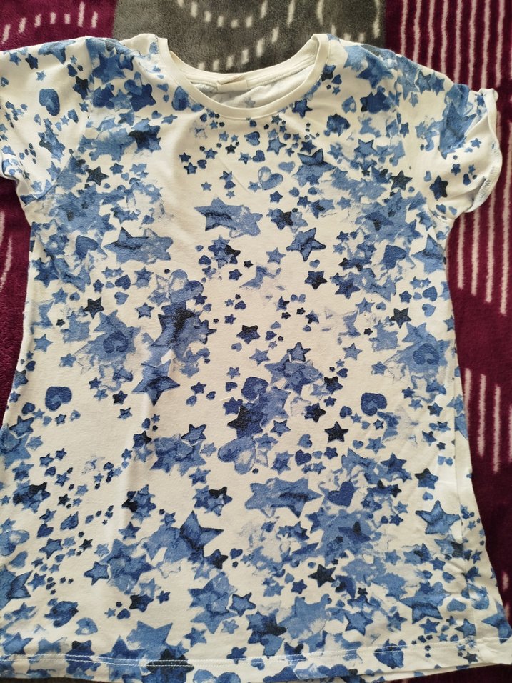Mavi batik yıldız desenli, kısa kollu, yuvarlak yaka, tişört. Yumuşak kumaştan, günlük kullanıma uygun.