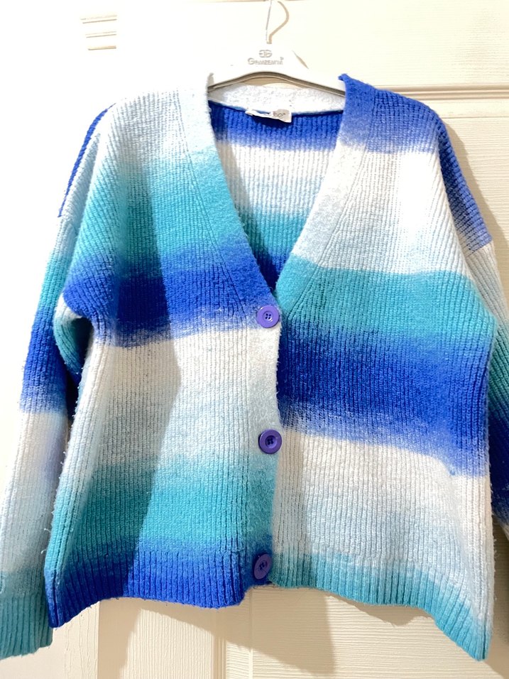 Kadınlar için mavi batik desenli, triko kumaştan, bol kesim uzun kollu hırka. Tekne yaka ve düğmeli, rahat ve modern bir tasarıma sahip.