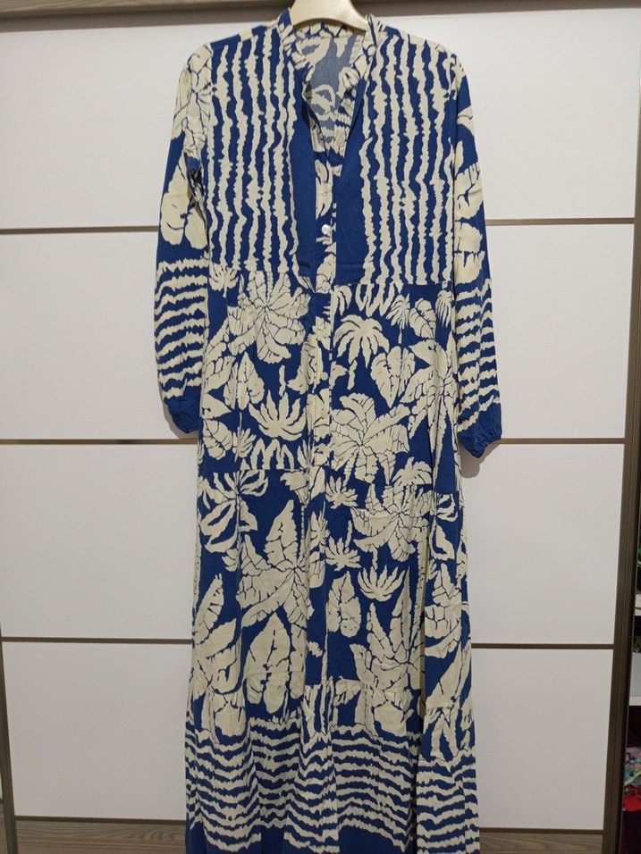 Mavi renkli, batik desenli uzun elbise. bol kesim ve V yakalıdır. Uzun kollu, bohem tarz için uygundur. renginde bir tık solma mevcuttur.