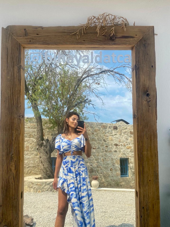 Mavi batik desenli, straplez yaka ve kısa kollu, bol ve drapeli kesime sahip denim kumaş uzun elbise. Bohem tarzda, açık hava kullanımı için uygundur.