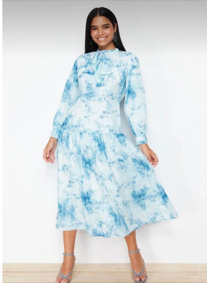 Mavi batik desenli, yüksek yakalı ve uzun kollu uzun elbise. Drapeli ve bol kesimli, pastel tonlarda bohem tarzda, ofise uygun.