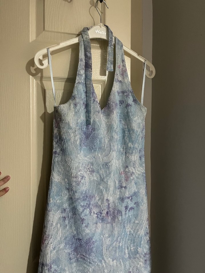 Bu uzun ve vücuda oturan elbise, halter yaka ve kolsuz tasarıma sahiptir. Yumuşak tekstil kumaştan yapılmış, pastel mavi batik deseni ve bohem tarzı ile günlük kullanıma uygundur.