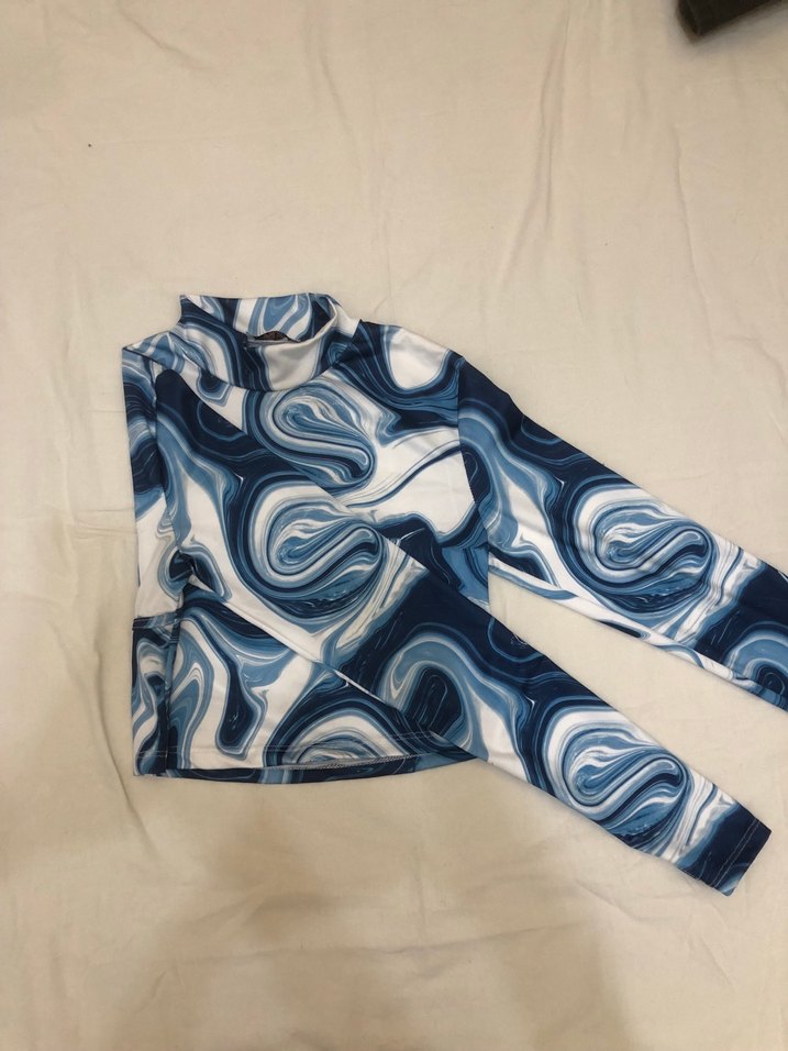 Mavi Batik Desenli Uzun Kollu Boğazlı Bluz