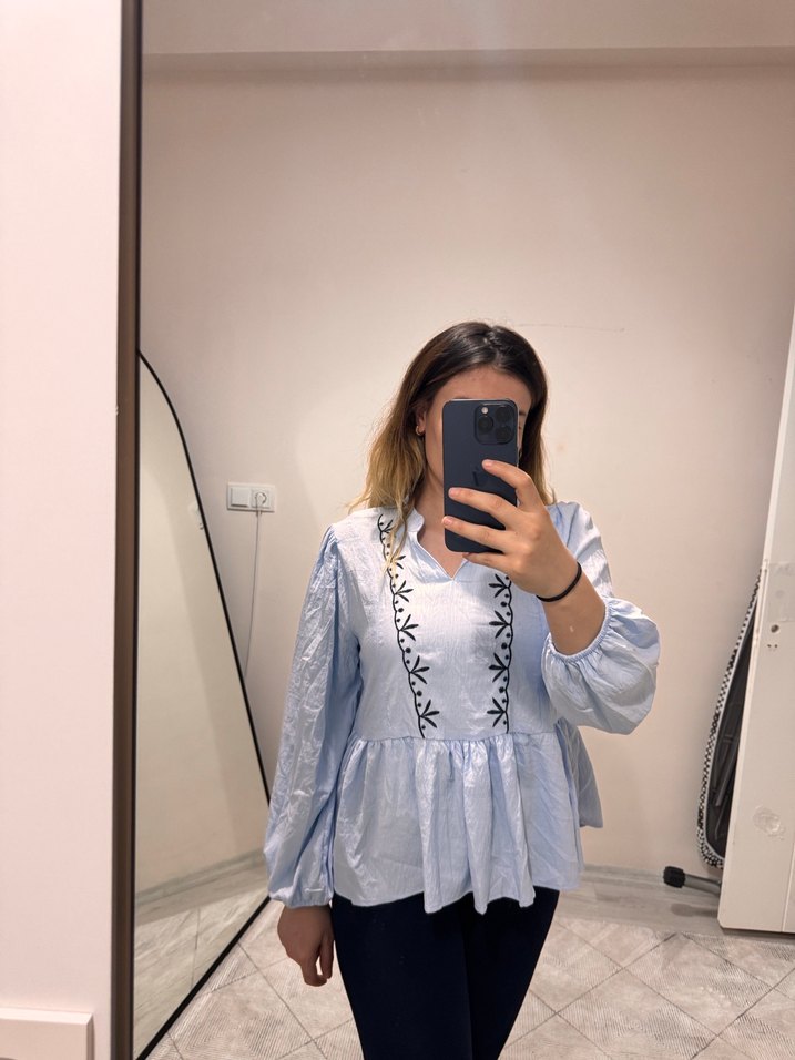 Mavi batik desenli, düğmeli, kısa boylu, bol kesim, uzun kollu V yaka kadın bluz. Denim kumaştan, günlük sokak stili için uygun.