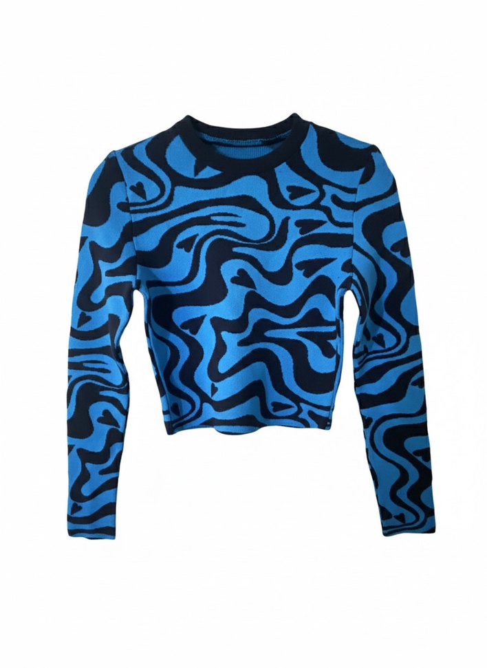 Uzun kollu, bisiklet yaka, mavi-siyah batik desenli, sentetik kumaştan örme, sokak stili için uygun, normal boyda kadın kazak. ✨