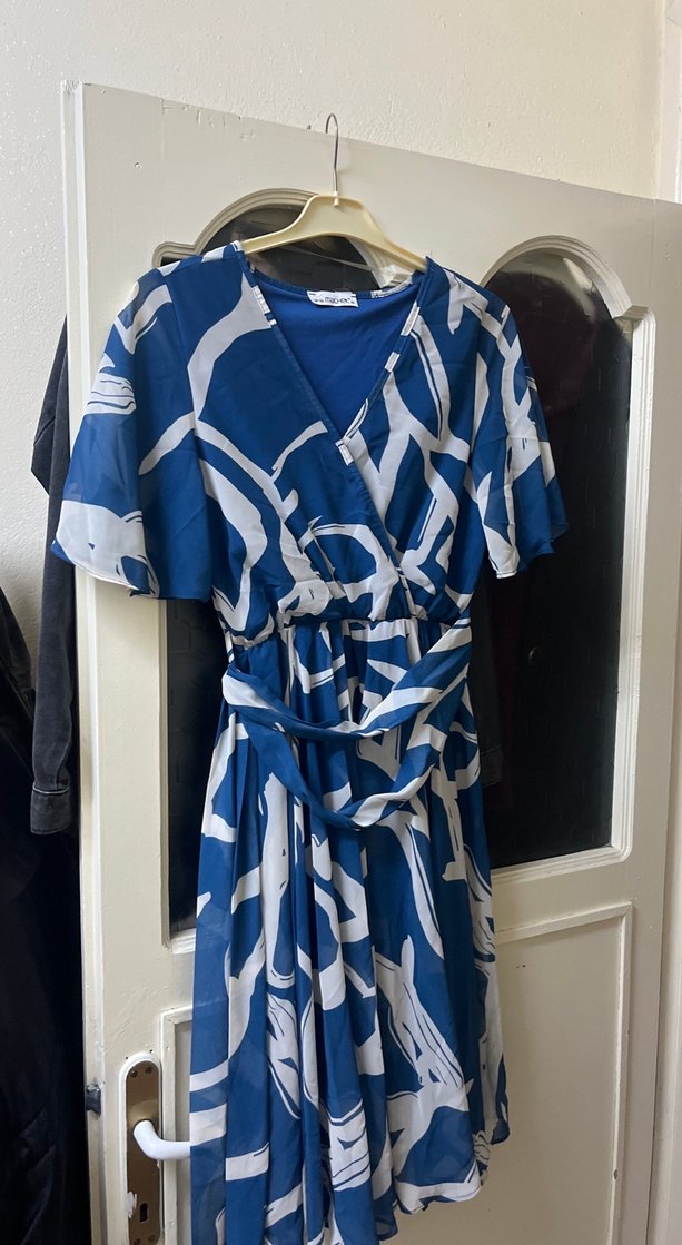 Mavi renkte, V yakalı ve bol kesimli uzun elbise. Drapeli tasarım, batik desen ve ince askılı kollara sahip. Sentetik kumaştan üretilmiş, günlük kullanıma uygun Paris tarzı.