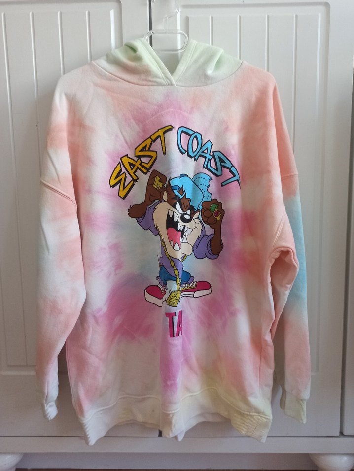 Yumuşak fleece kumaştan, pastel renkli batik desenli, kapüşonlu ve bol kesim kız sweatshirtü. Kabartmalı uzun kollu ve renkli 'East Coast' baskılıdır.