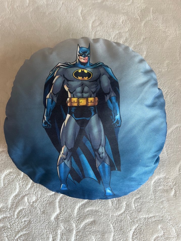 Mac renkte Batman figürlü yuvarlak yastık, pürüzsüz kumaş yüzeylidir.