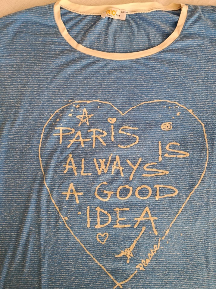 Yumuşak denim kumaştan, kısa kollu ve yuvarlak yakalı bol kesim tişört."Paris is always a good idea" yazılı baskılı kalp desenli.