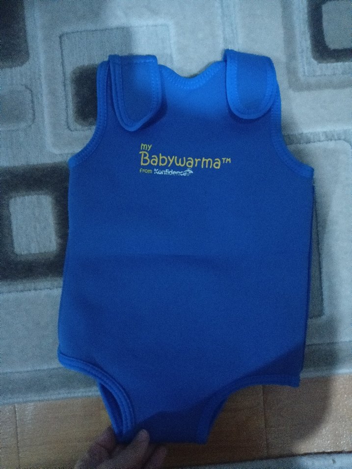 Yumuşak ve sıcak kumaştan, mavi askılı bebek bodysuit. Yuvarlak yaka ve velcro kapamalıdır. Üzerinde renkli 'Babywarma' baskısı bulunur.