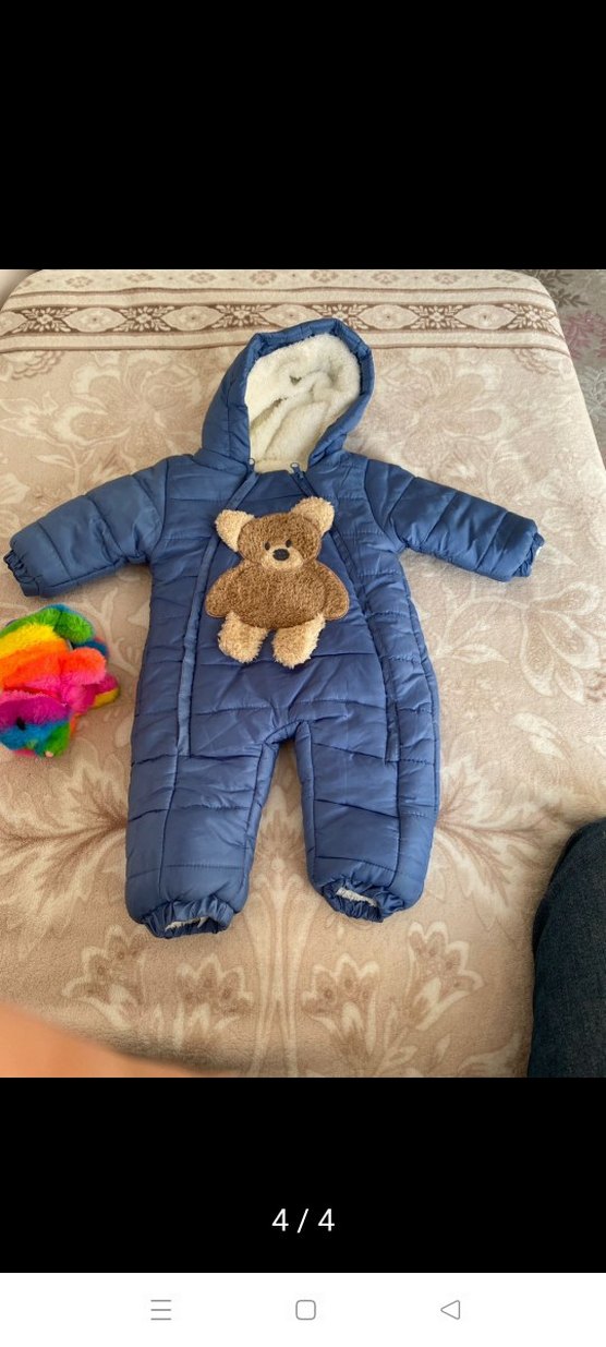 Kürklü kapüşonlu, yumuşak ve sıcak kumaştan mavi bebek tulumu. Önünde ayıcık detayı ve lastikli manşetler bulunur. ❄️