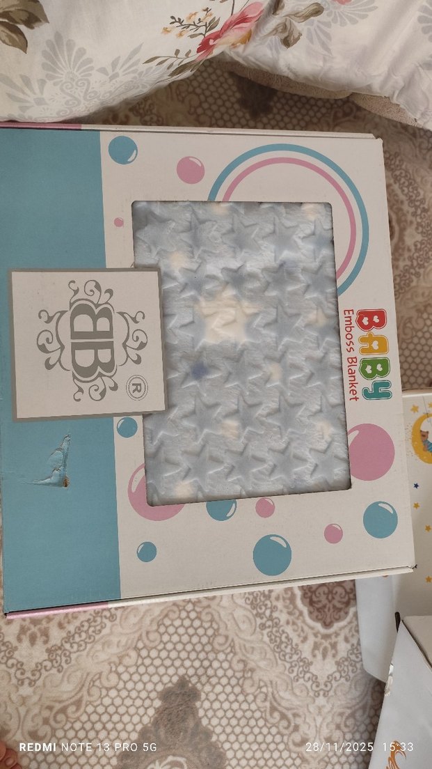 Yumuşak mavi polar çocuk battaniyesi, pastel yıldız desenli ve kabartmalı dokulu. Ambalajda "G, BABY" yazısı bulunur. Bebekleri sıcak tutar. ️