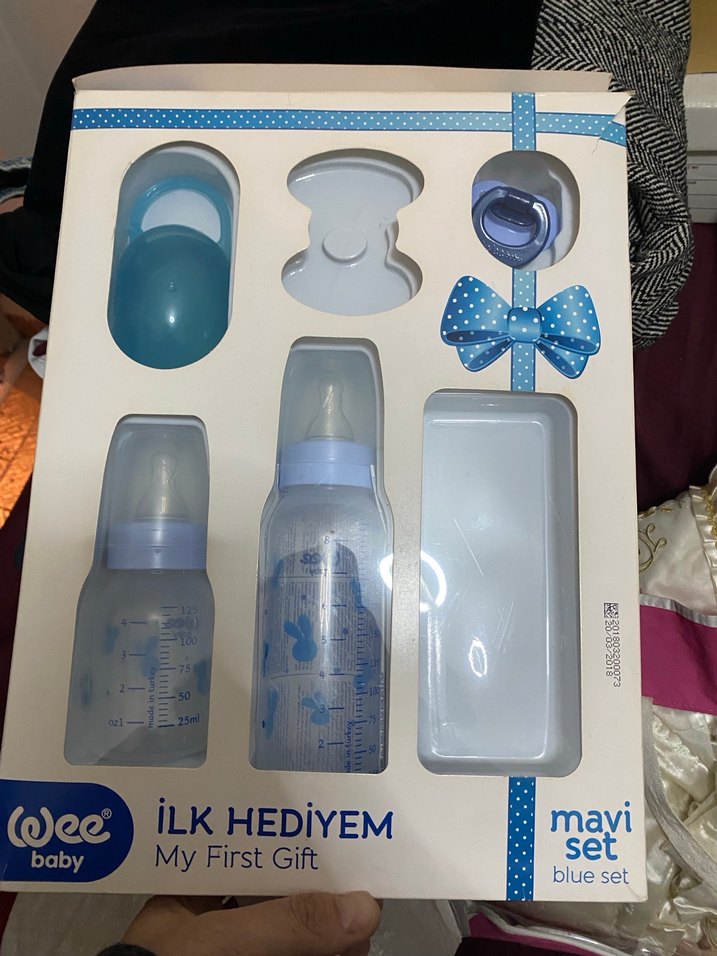 Mavi renkli bebek besleme seti, iki biberon, emzik, biberon tutucu ve küçük bir tepsi içerir.