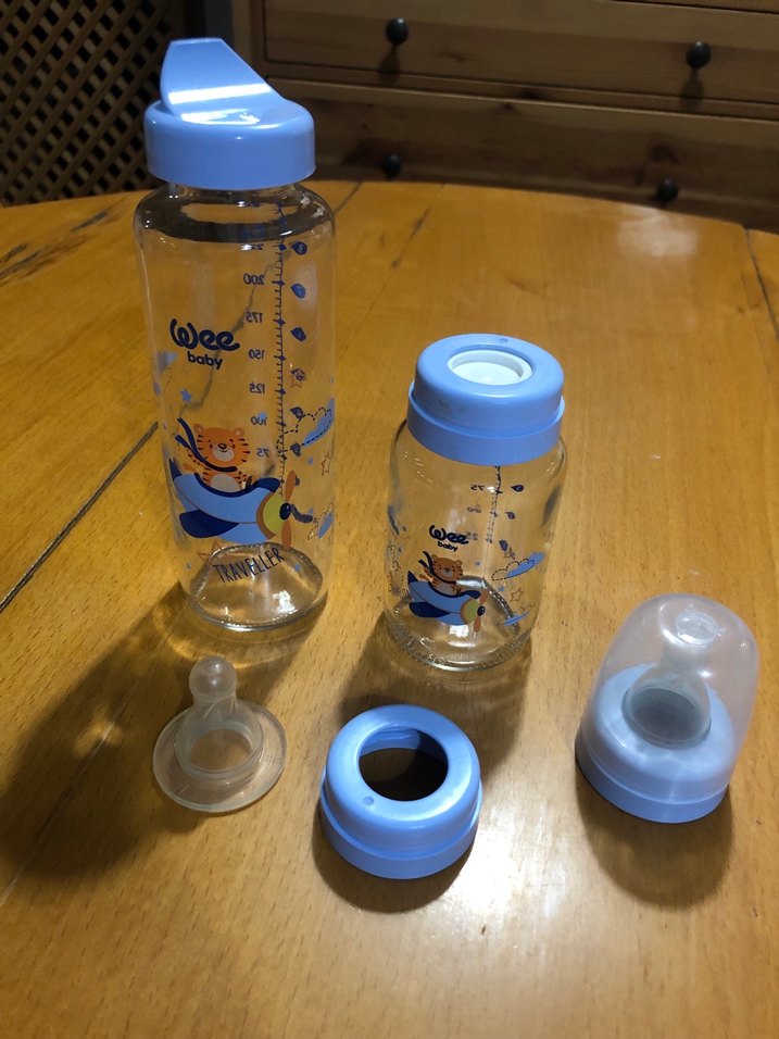Mavi renkli, renkli desenlere sahip iki bebek biberonu ve değiştirilebilir kapaklar ile emziklerden oluşan set. Besleme için kullanışlı.
