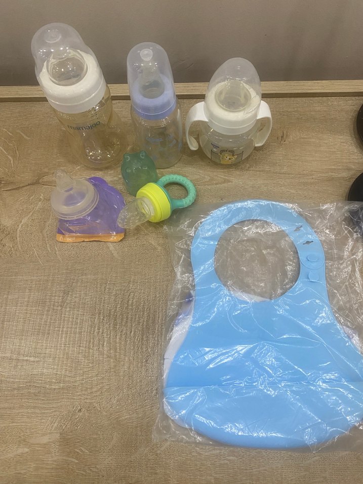 Üç farklı kapaklı bebek biberonu ve açık mavi önlük içeren set. Çeşitli emzik ve aksesuarlar da bulunmaktadır. Adet fiyatıdır biberonlar uç ve önlük hiç kullanılmamıştır. Diğer katı meyve yiyeceği bir kez kullanıldı