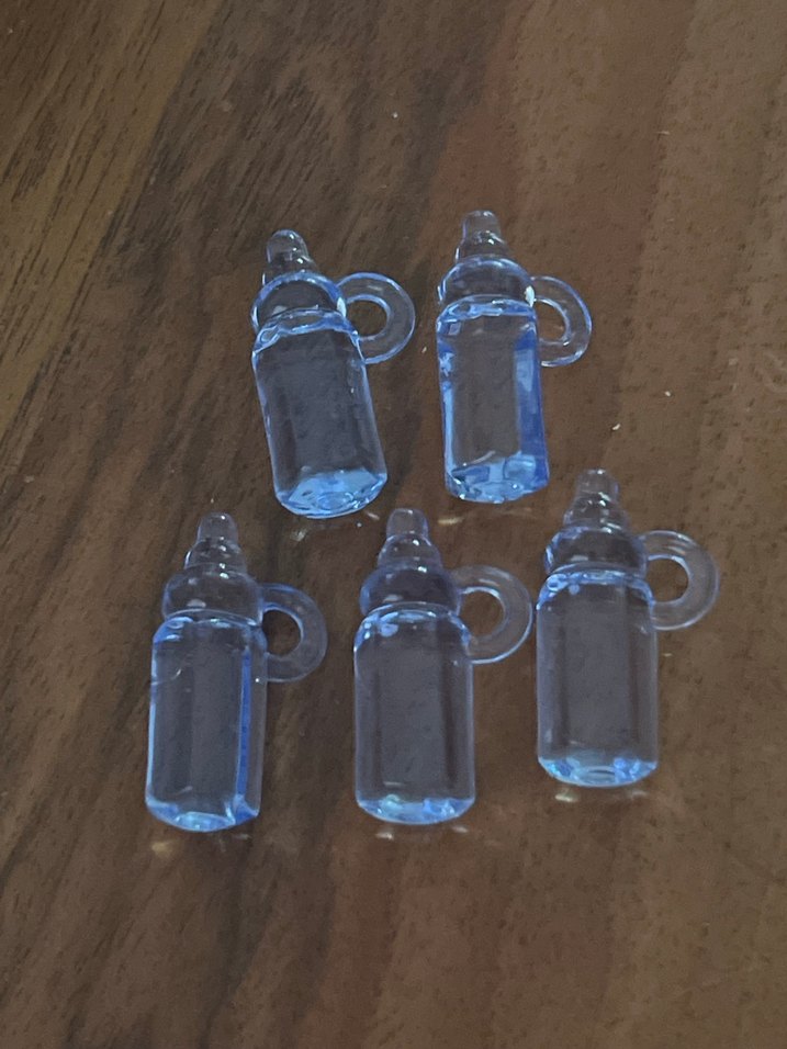 Beş adet küçük, renkli mavi bebek biberonu halkalı ve şeffaf malzemeden yapılmıştır.